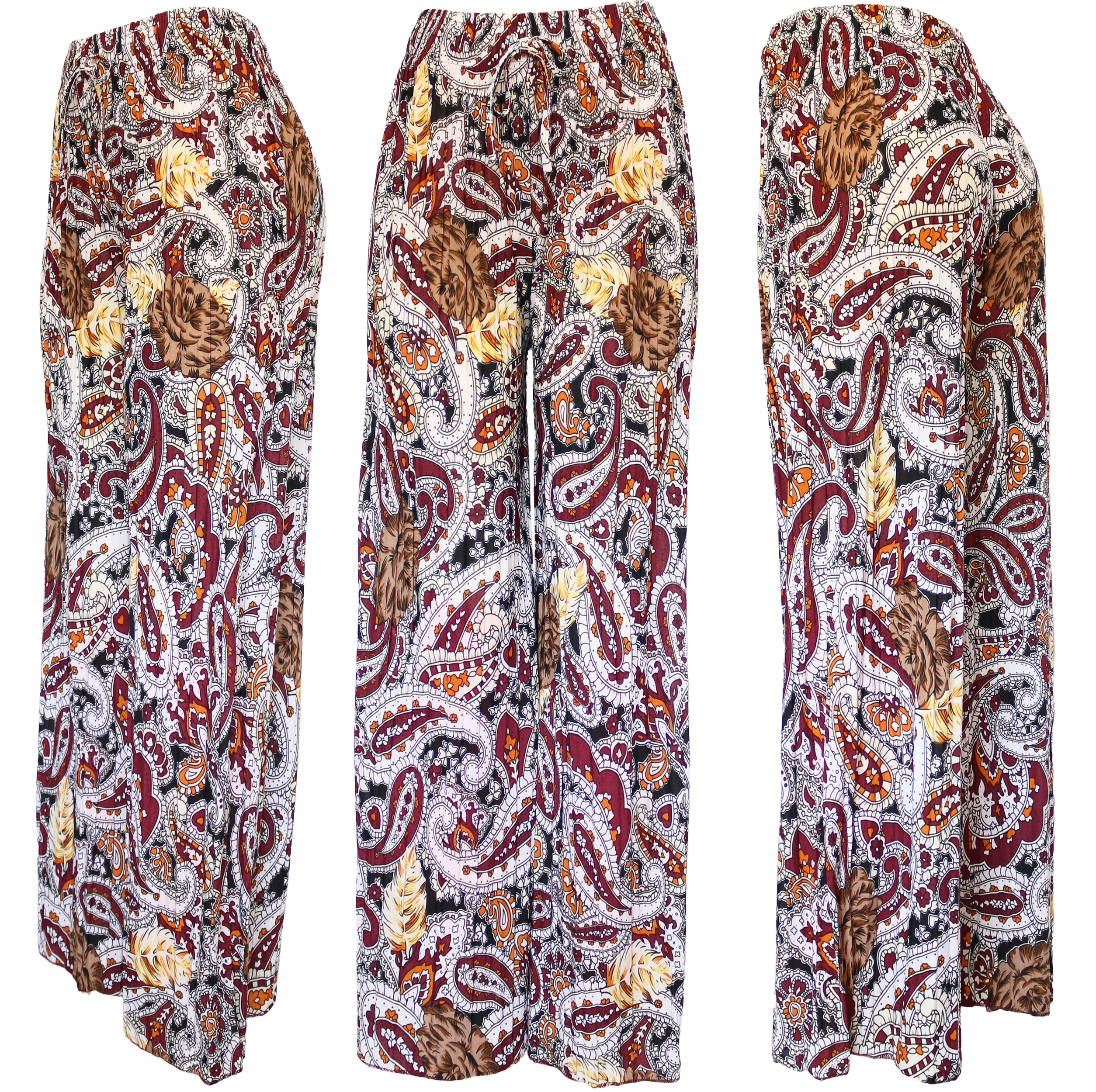Burgundy Paisley Pleated Palazzo Wide Leg Lounge Summer Pants