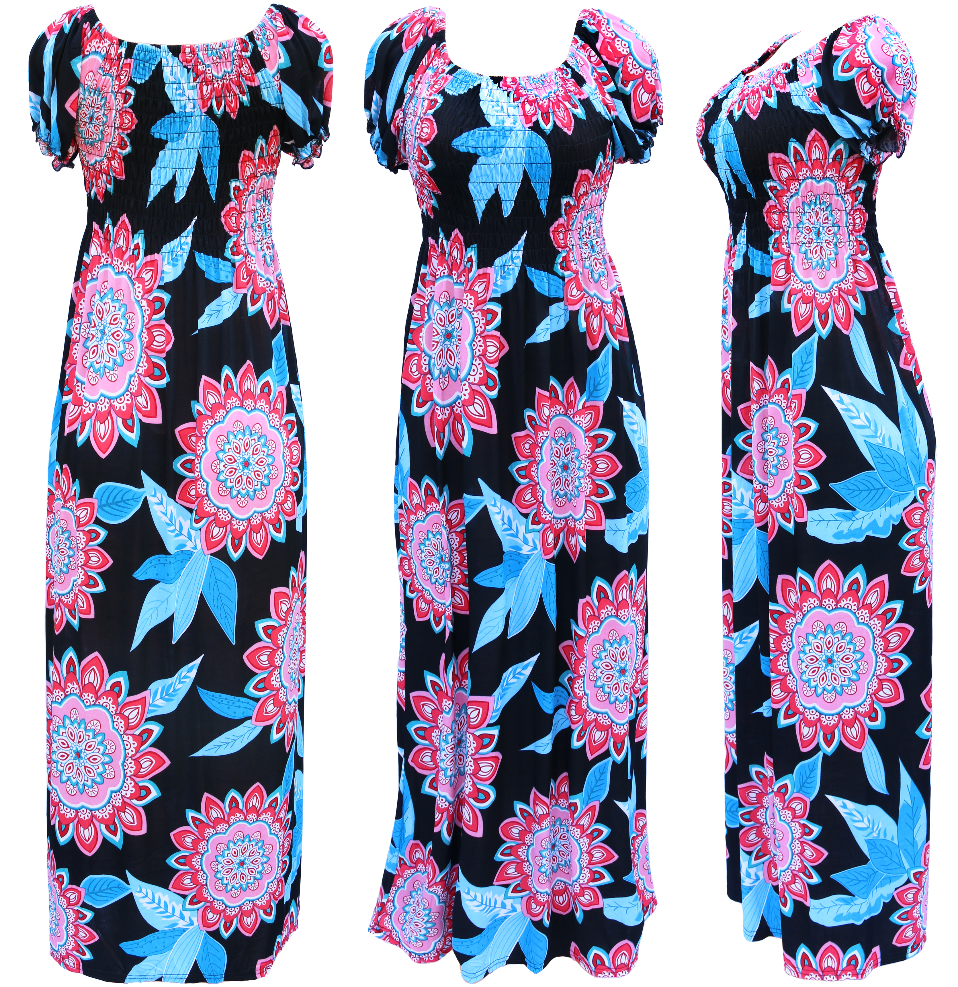 Must have summer maxi dress for beach, shopping and everyday wear. Dresses features flower print theme. Made out of super soft, breathable and stretchy fabric blend that is ideal for summer. Silky smooth  blend materials feels super soft and cool in the summer time comparing to other materials. Fashionable print and flattering design makes those dresses a must have this spring/summer season. Super easy dress to "jump in" on rush. Wear it everyday - for a beach, picnics and shopping. Smocked design is comfortable and stretchy.